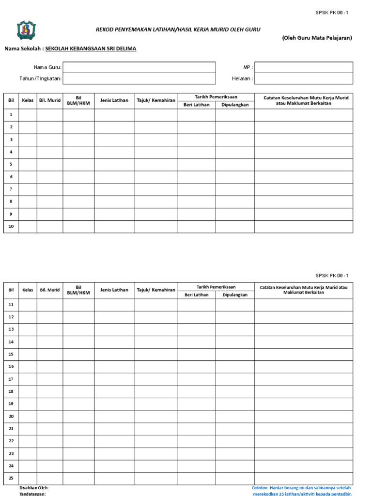 Semakan hasil kerja murid by afandir_1. Rekod penyemakan buku latihan spsk pk06 01 sila tandakan pada ruangan yang berkenaan nama murid perkara bilangan latihan cukup kurang dsb kepelbagaian jenis latihan nota kesesuaian cara menanda. Hasil kerja borang semakan buku latihan murid.