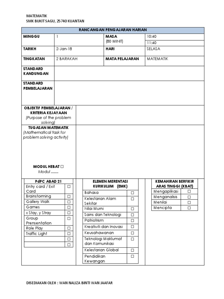 Buku rekod mengajar merupakan buku himpunan pelan tindakan guru sebelum mengajar. 2016 RANCANGAN PELAJARAN HARIAN MINGGU HARI TARIKH MOD TINGKATAN PEMBELAJARAN MPELAJARAN Perbincangan Kerja MASA Kumpulan TAJUK Simulasi Luar bilik darjah Pada akhir pelajaran pelajar dapat. 5114 Melaksanakan pengajaran dengan mempelbagaikan strategi dan teknik pengajaran.