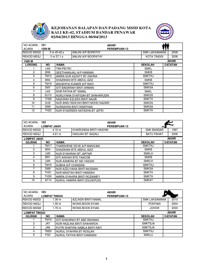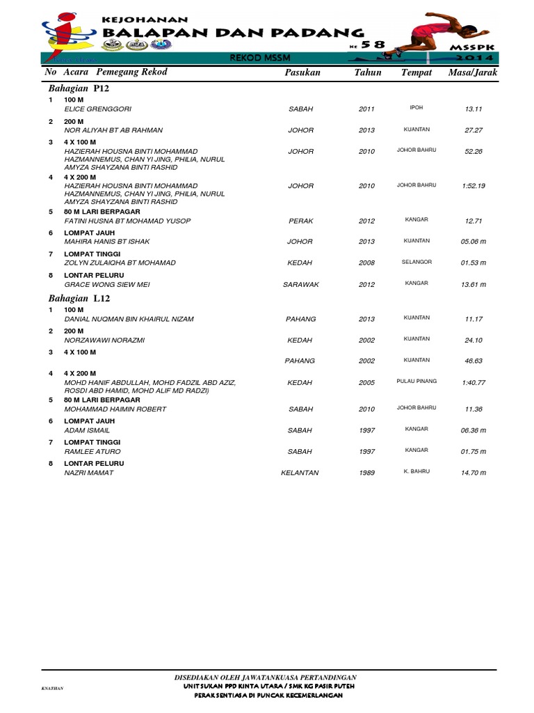 Rekod MSSM Terkini 2014 by Anniyan5393 in Types Presentations. Merejam lembing malajski jezik. Rekod mssm 2 m 1597 s savinder kaur ap joginder singh selangor 2013 rekod asg 2 m 1331 s khuat phuong anh vie 2015 separuh akhir 1 2 ked lor no nama pasukan masa 1 5 a043 wan syafieka emylia bt wan saifolizal perak 2 m 3959 s q 2 8 t755 ar-rumaisya binti abdullah terengganu 2 m 3968 s q 3 6 c162 nur alya maisara binti mohdzalisham.