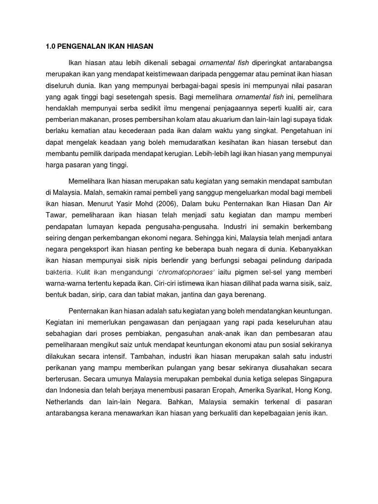 Oleh itu buku Panduan Penjagaan Ikan Hiasan dan Akuarium diterbitkan khusus untuk anda untuk memberikan pendedahan tentang cara pemeliharaan ikan hiasan ini. Berikut adalah contoh penjadualan rekod ladang yang boleh. Kulit ikan mengandungi chromatophoraes iaitu pigmen sel-sel yang memberi warna-warna tertentu kepada ikan.