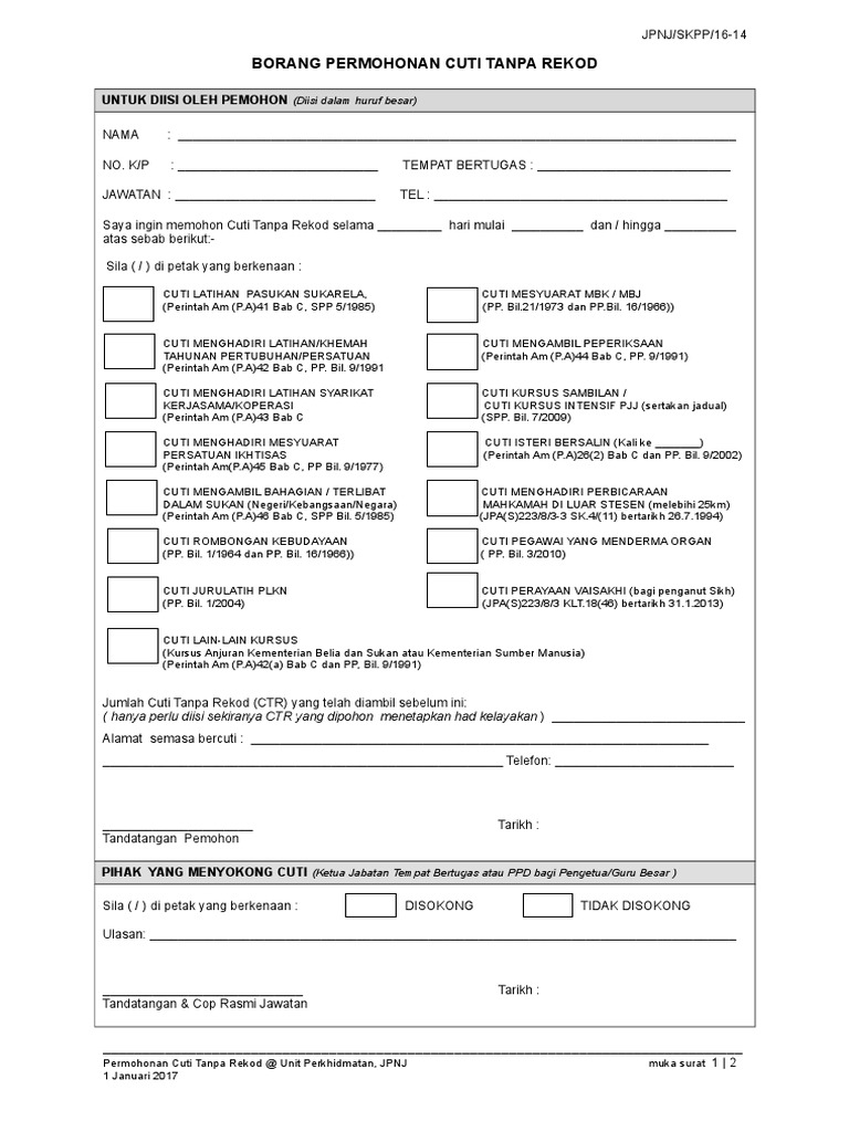 January 7 2019 9325 views. Borang Kemaskini Januari 2020 BPL NIJK6208PTS7 14012020 1222 BORANG PERMOHONAN CUTI TANPA REKOD CTR Perintah Am Bab C Cuti Tahun 1974 Surat Pekeliling Perkhidmatan Bil. Program pensiswazahan guru sekolah rendah pgsr mod kursus dalam cuti modul pra3105 perkembangan kognitif kanak-kanak bahagian pendidikan guru sektor pembangunan profesionalisme keguruan kementerian pelajaran malaysia berkuat kuasa pada november 2008 semester 4 major ijazah sarjana muda perguruan ipgm.