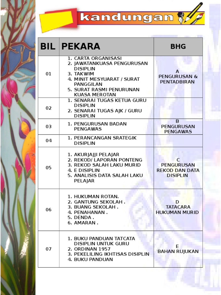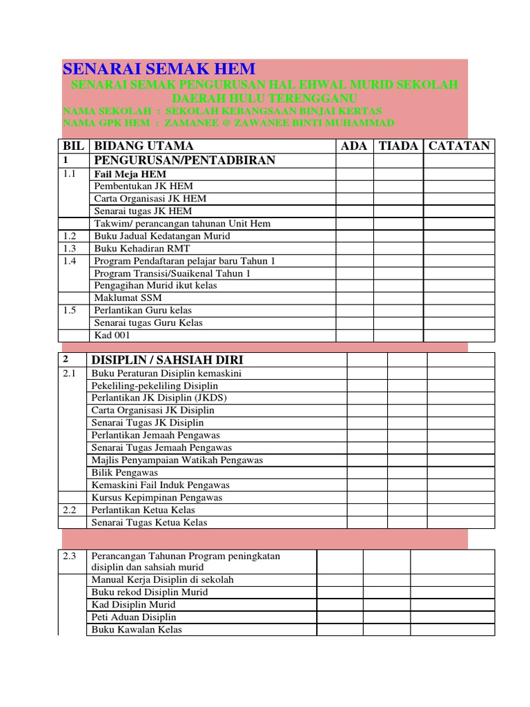Sebagai contoh setiap hari berapa ramai murid yang ponteng berapa ramai yang ponteng kelas berapa ramai yang menghisap rokok dan sebagainya. 61 PENGURUSAN DISIPLIN PELAJAR 611 OBJEKTIF 6111 Memastikan disiplin dan peraturan sekolah dikuatkuasakan. Senarai Semak Rekod Peribadi Murid There is document - Senarai Semak Rekod Peribadi Murid available here for reading and downloading.