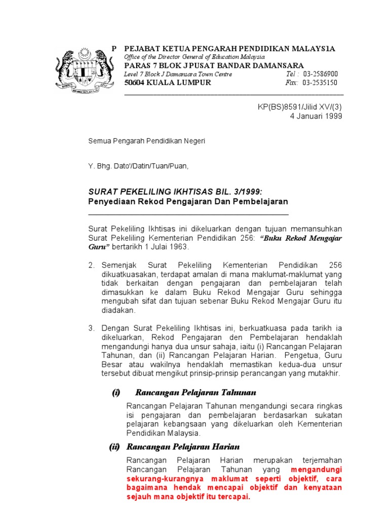 Surat Pekeliling Ikhtisas Bilangan 3 Tahun 1999 Penyediaan Rekod Pengajaran Pembelajaran