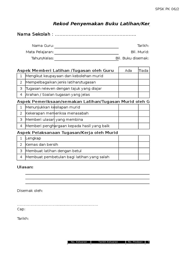 Pk 06 1borang pengesanan semakan hasil kerja murid diisi oleh guru mata pelajarannama guru siti musiah binti matnor kelas. Borang Semakan Buku Kerja Murid di sini. Aspek Pelaksanaan TugasanKerja oleh Murid 1 Lengkap 2 Kemas dan bersih 3 Membuat latihan dengan betul 4 Membuat pembetulan bagi latihan yang salah.